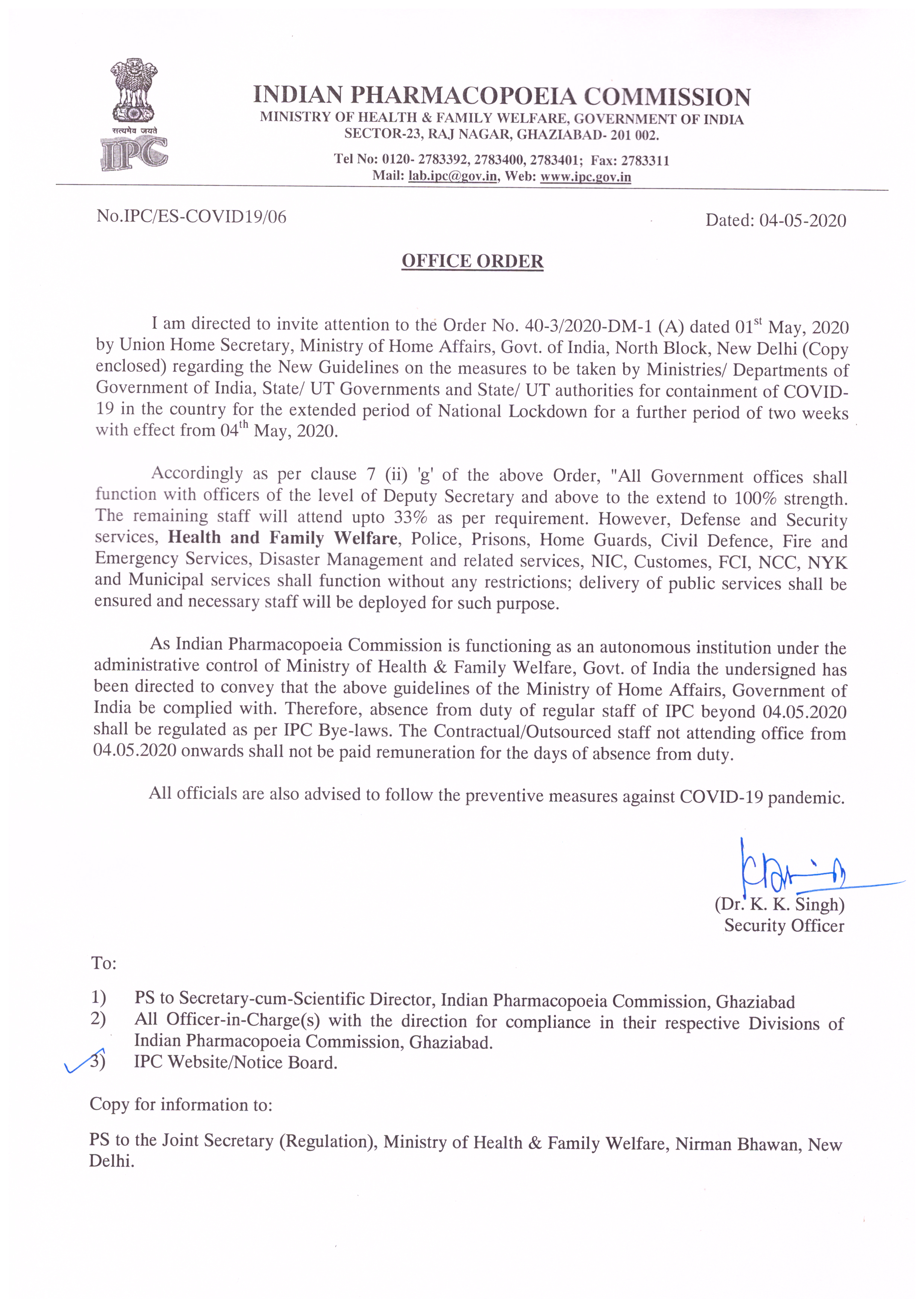 IPC Office Order dated 04.05.2020 for Regular/Contractual/Outsourced Staff of IPC